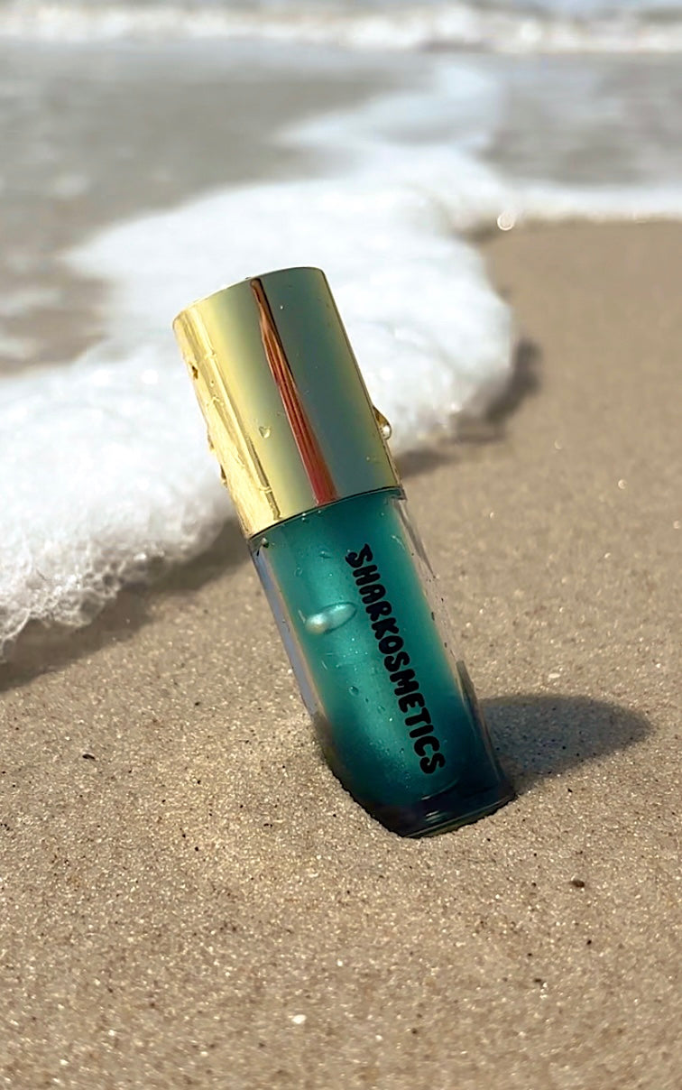 "Get your lips sparkling with Gilded Lagoon! This aqua colored lip gloss is infused with tropical punch scent and gold sparkles, inspired by the playful and fierce nature of sharks. Add a touch of whimsy to your makeup routine and make a splash with Gilded Lagoon. (Shark not included!) 🦈🍹"
