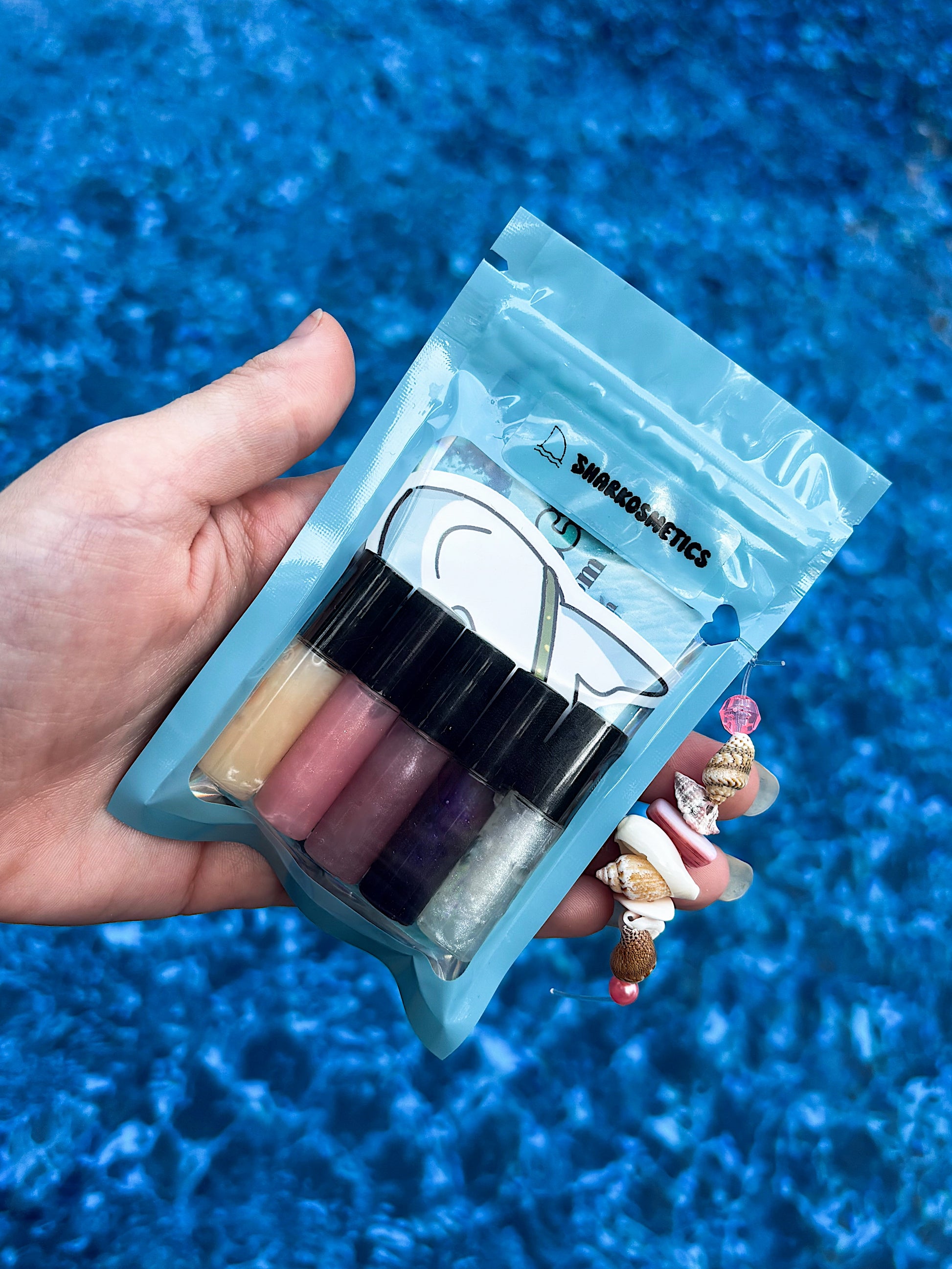 Spread joy and appreciation with our Sample Baggies! These variety packs make perfect party favors and thank you gifts, or if you just want to try them out! With fun touches like 5 randomly assorted sample sized glosses (Jellyfish Jewel, Shark Bait, Midnight Zone, Saltwater Shore, Mother of Pearl, Blood in the Water, and Coral Berry), a shark sticker and business card included, they're sure to make a splash! (Did you catch our pun?)